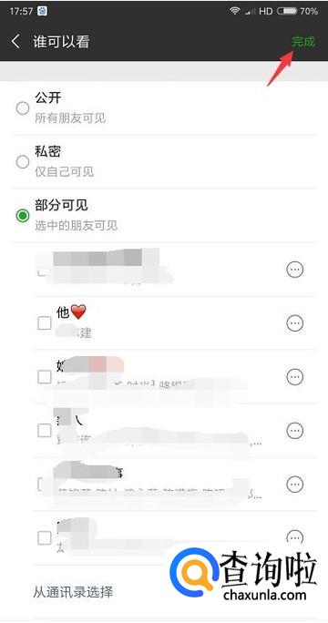 然后我们就可以选择自己想要指定看的人所在的分组标签了,选择好后点击右上角的完成。