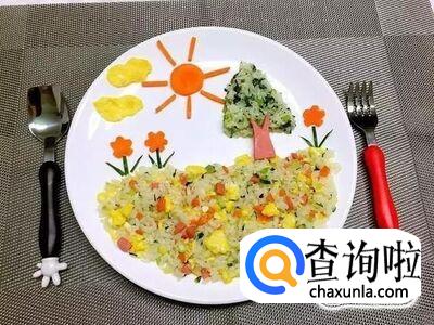 先准备好食材,蛋炒饭(可适当加火腿肠等等)、胡萝卜、青菜炒饭,鸡蛋饼。将蛋炒饭如图所示铺好,再把胡萝卜铺成小花太阳的形状,大树的顶部则是青菜炒饭。