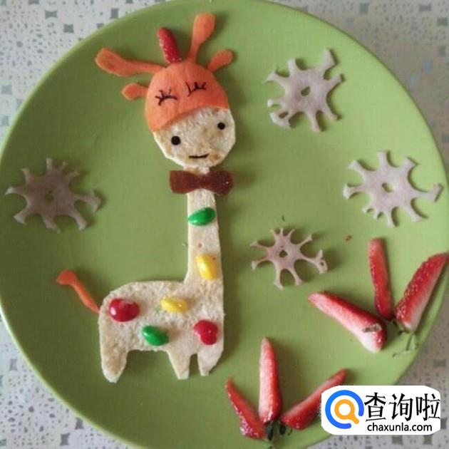 如图所示,找好适当的模具,把米饭做成小鹿的形状,并在上面点缀一些果酱。把胡萝卜切条,作为小鹿的头部和尾巴,草莓切条,反正盘子边缘作为装饰。