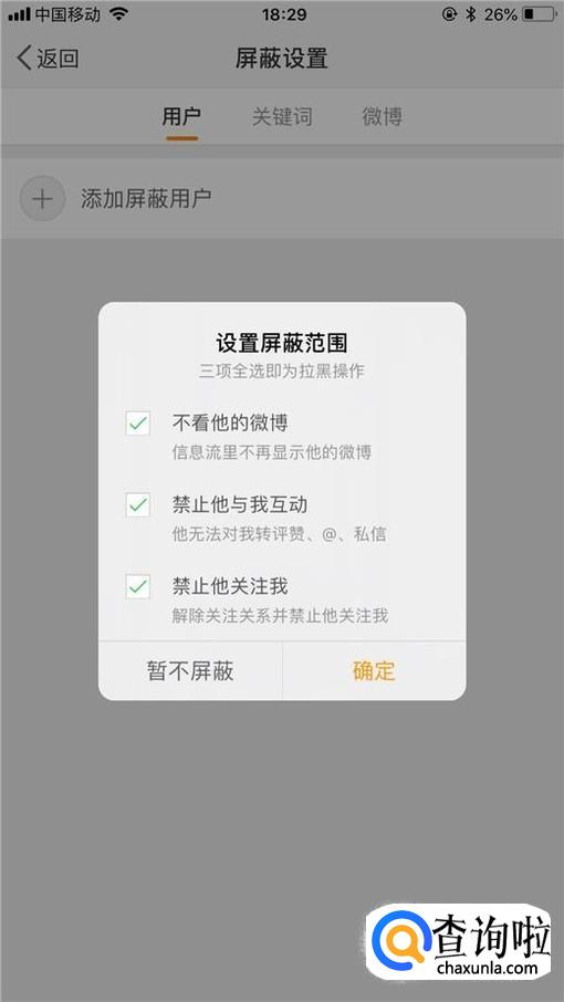 接着点击添加屏蔽用户,如下图所示。