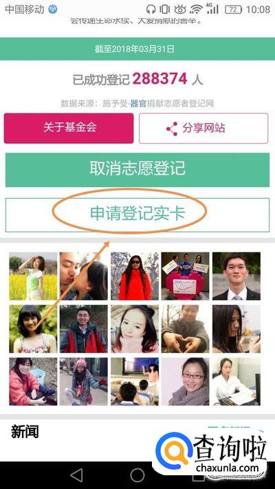 向下滑动器官捐献登记网页,看到申请登记实卡点击。如图所示。