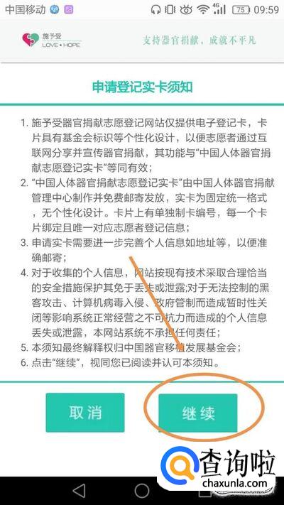 进入后认真阅读申请登记实卡须知,阅读完毕后,点击继续。如图所示。
