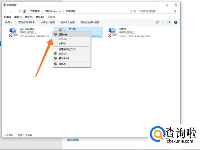 弹出菜单选项后,单击“启用”即可重新启用无线网络连接。