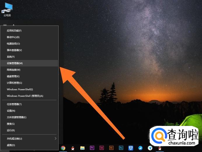 鼠标右击“开始”图标弹出菜单选项后,点击进入“设备管理器”。