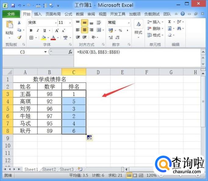 再在选择这个结果的单元格,然后将鼠标移动右下角鼠标变成黑色的十字加号时向下拖动填充,这样我们就得到了所有的排名,如图所示: