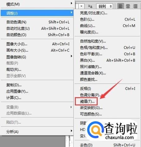 设置好高反差保留的数值之后我们再在图像菜单那里找到调整选项,点击该选项在其子级菜单哪里找到阈值选项,如图所示:
