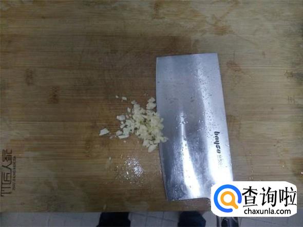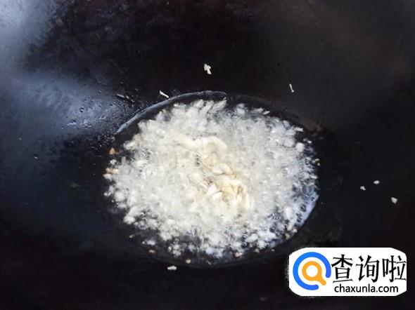 待油烧开后我们倒入刚才剁碎的蒜沫煸香。