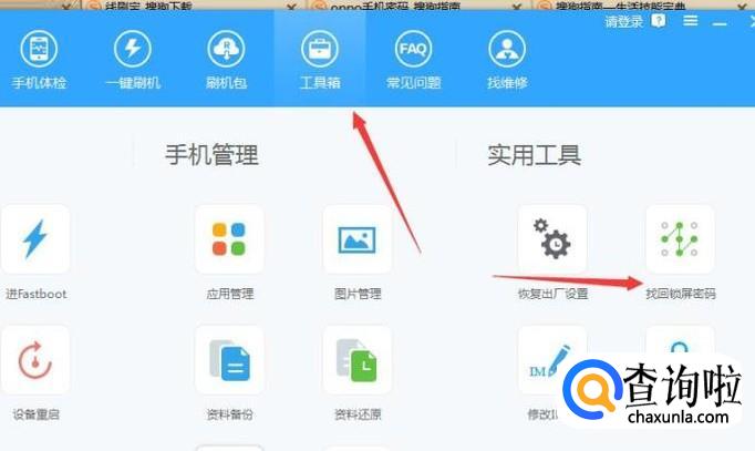 连接成功后,我们点击线刷宝顶部的“工具箱”进入,我们会看到“找回锁屏密码”的功能。