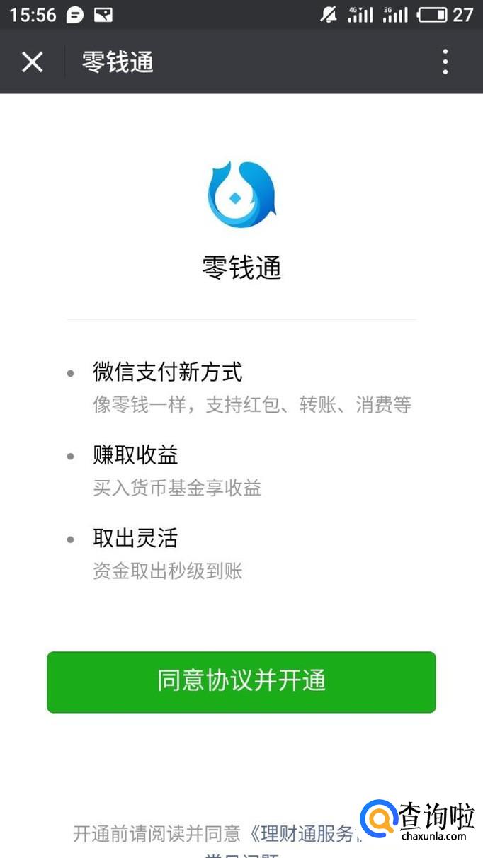 连接打开以后点击打开下方的同意并开通,就可以开通微信的零钱通用了。