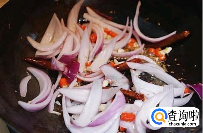 然后在锅中倒入适量的油,烧热后放入辣椒+姜蒜爆香,加入洋葱翻炒几下。