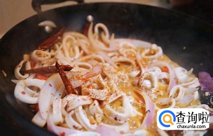 最后把鱿鱼放下去,加适量盐,生抽翻炒均匀,大火快速翻炒两分钟,再加少许鸡精,葱花翻炒均匀即可出锅。