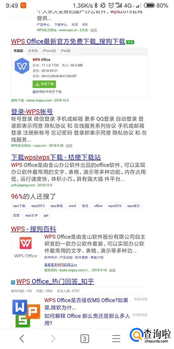 首先使用搜狗浏览器搜索WPS,点击打开官网下载安装WPS手机软件;