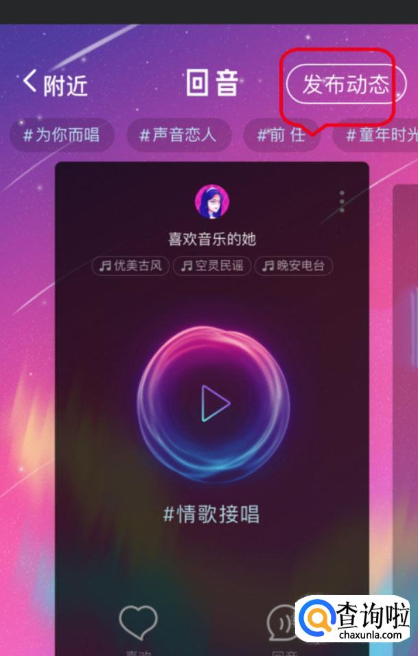 点击“发布动态”,选择话题,按住拍摄按钮录制声音,点击“下一步”——“发布”,即可发布声音状态。