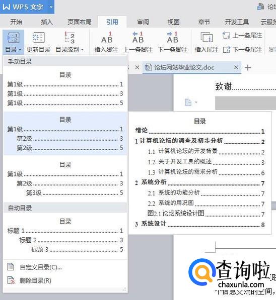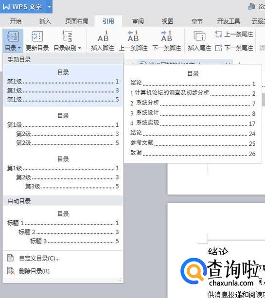 依次设置完所有标题格式后,点击【引用】——【目录】,便会自动生成目录。目录下拉列表可以选择你喜欢的目录样式应用在文档中。