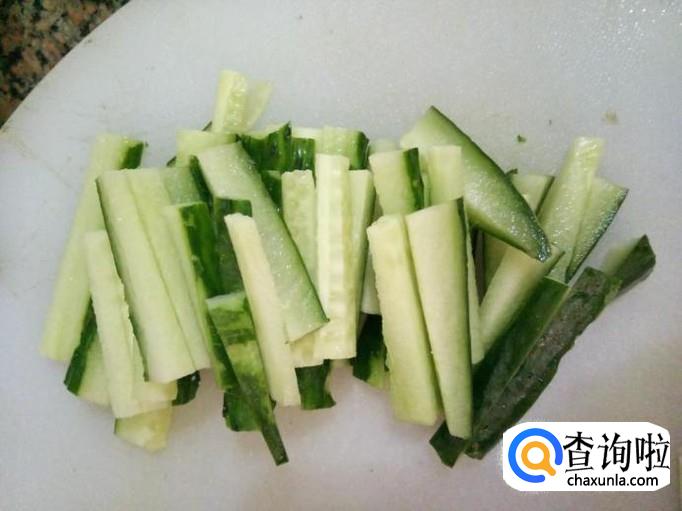 取二分之一根黄瓜,将黄瓜表面的刺刮掉,洗净,再切成细条状;大小要和胡萝卜相近;
