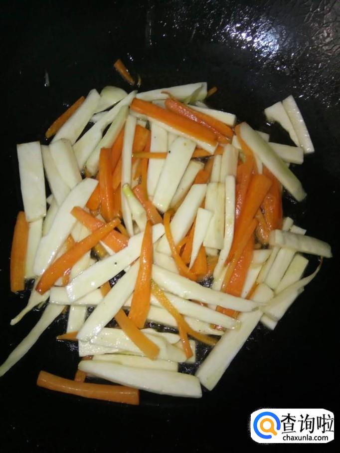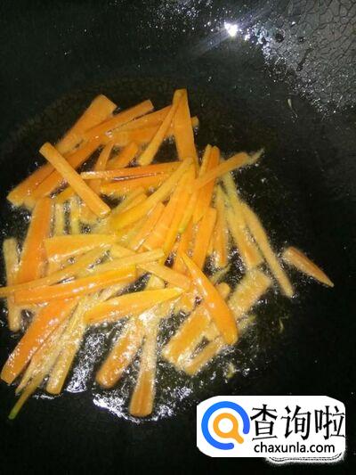 开火,加入适量的食用油,待油温升高后,将胡萝卜下入锅里,翻炒至颜色由深变浅黄色;炒熟为止,胡萝卜没熟的话,它的营养无法被人体吸收了;