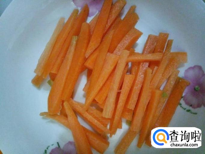 取二分之一根胡萝卜,将胡萝卜去皮,洗净,切成细条状;这样切更容易炒熟,煮熟了也比较好夹;