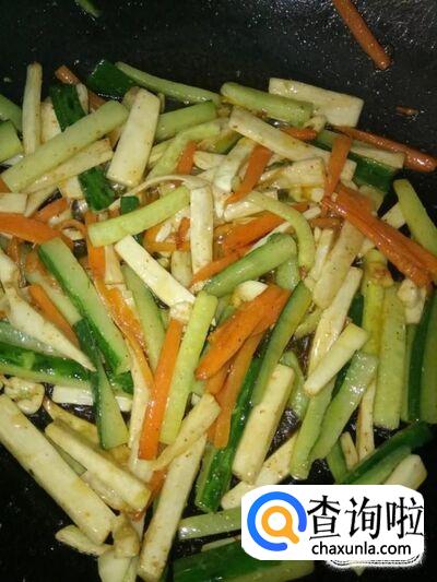 将黄瓜也下入锅里,一起翻炒;