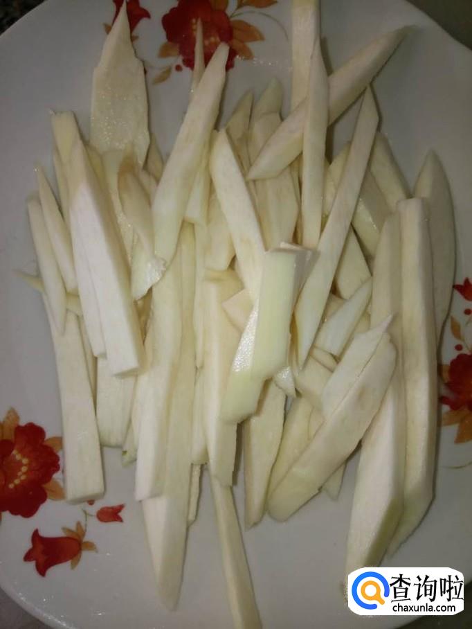 取一根小根的茭白,将茭白的叶子去掉,洗净,切成细条状;大小尽量和胡萝卜、黄瓜相近;