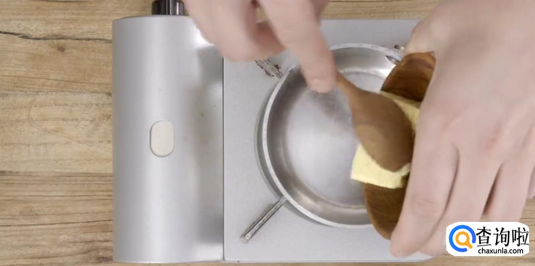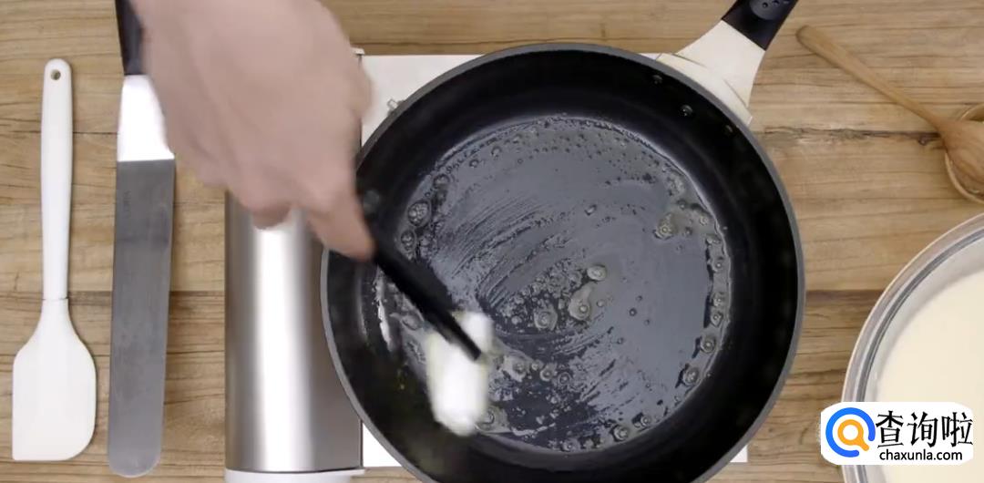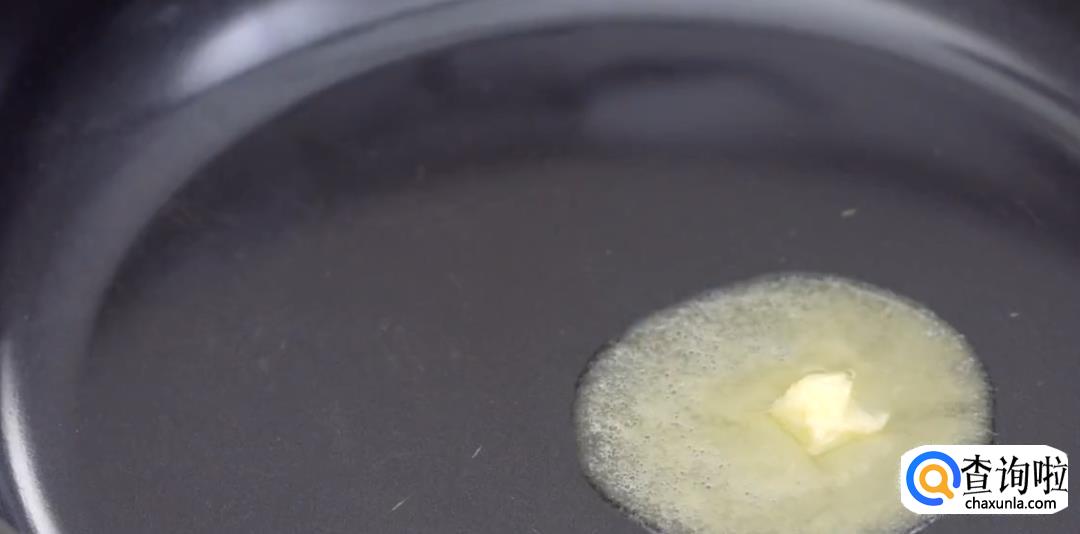 热锅放入黄油,融化后均匀涂抹在锅底,并吸取多余的油分。