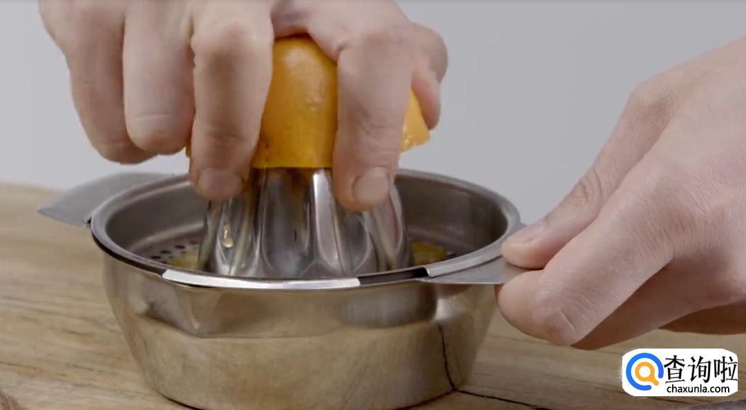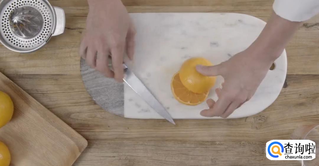 先取两个柑橘,对半切开,榨橙汁。