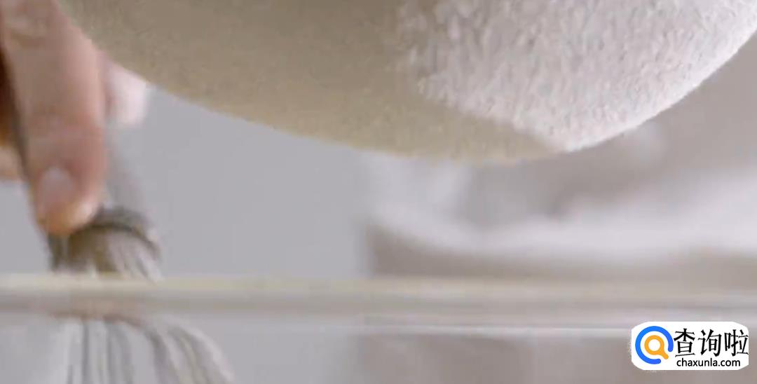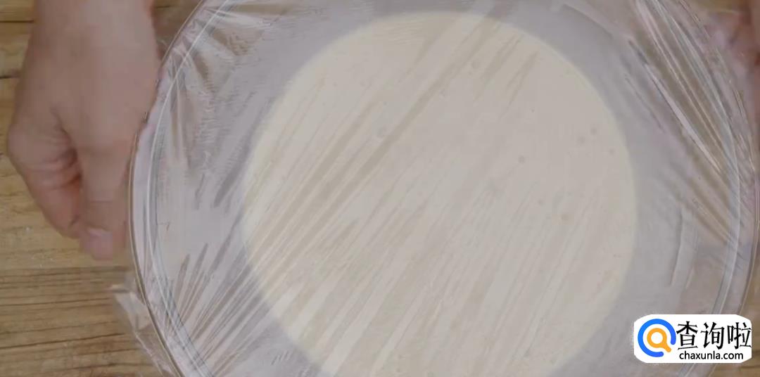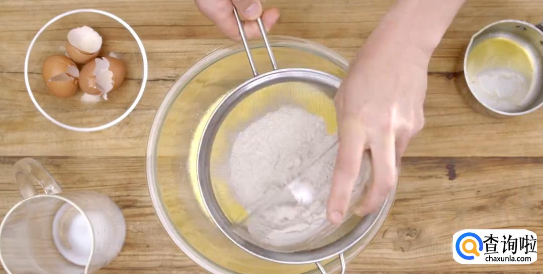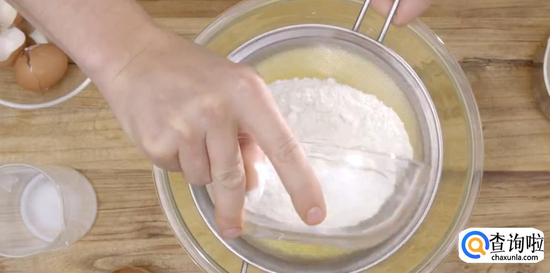 搅匀后加入面粉,要一边筛粉一边搅拌,蒙上保鲜膜密封片刻。