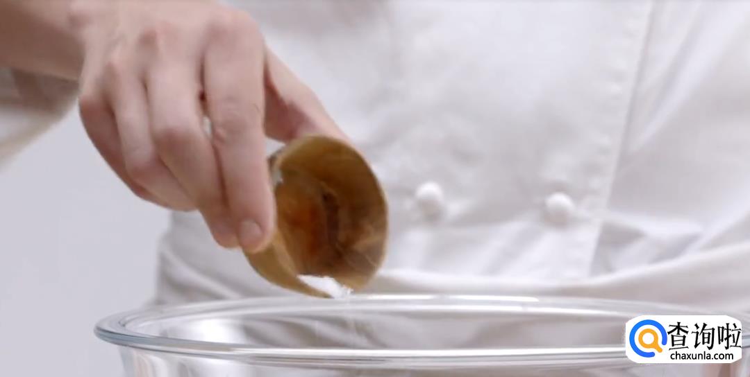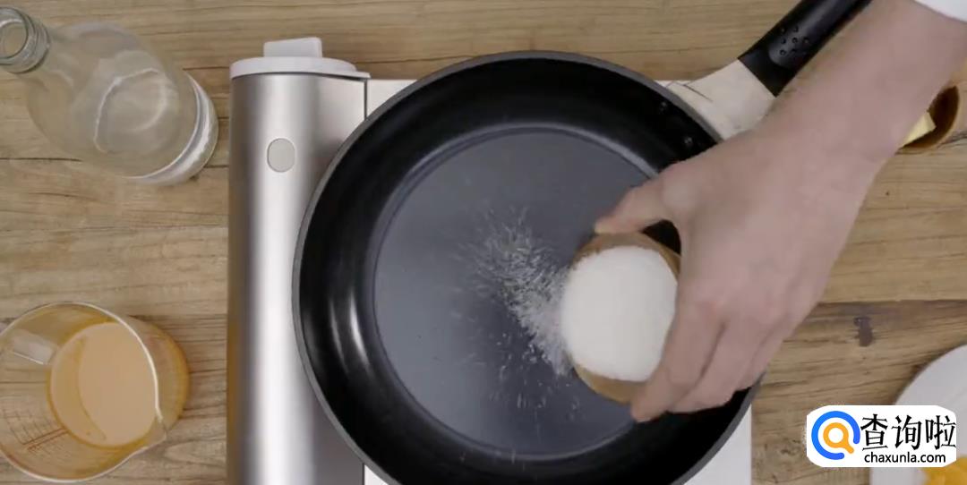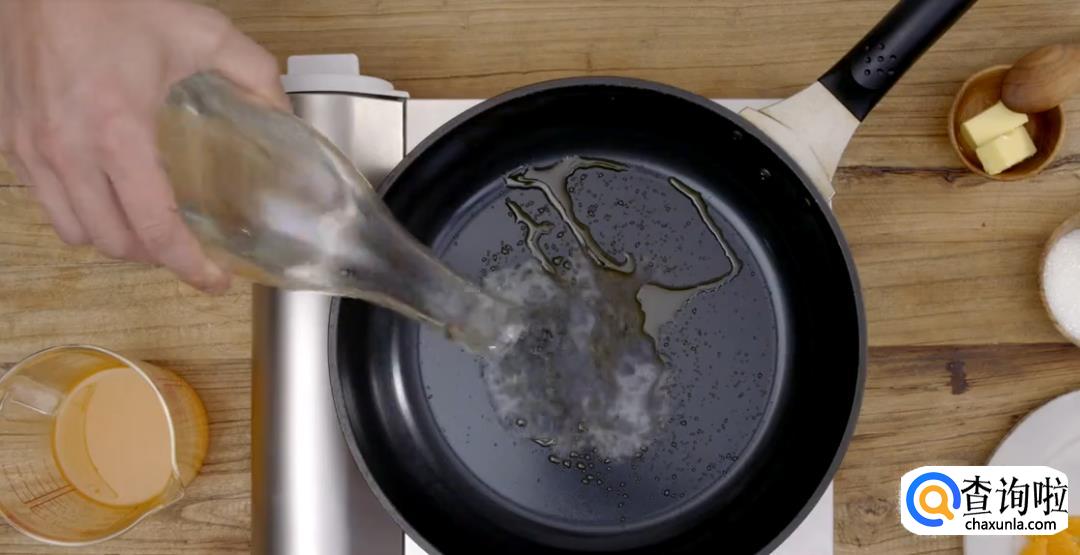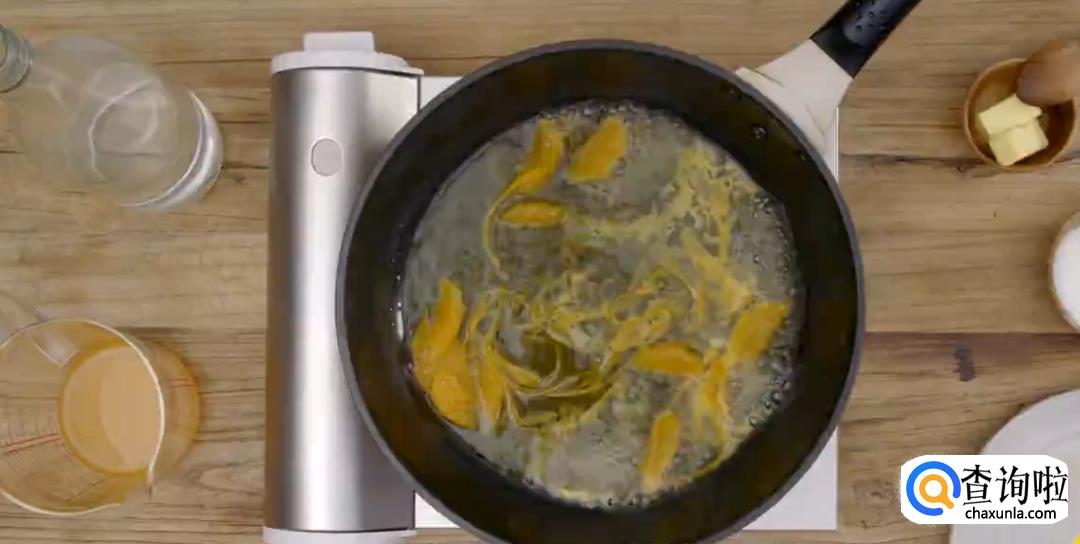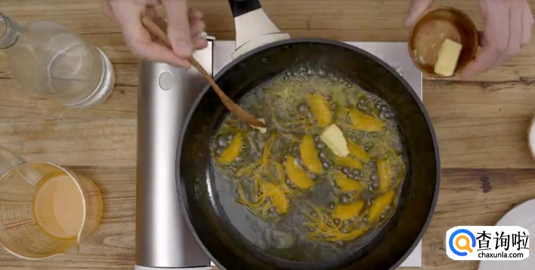 将白糖倒入热锅中,保持中火,烧成焦糖。倒入君度酒烧一下。