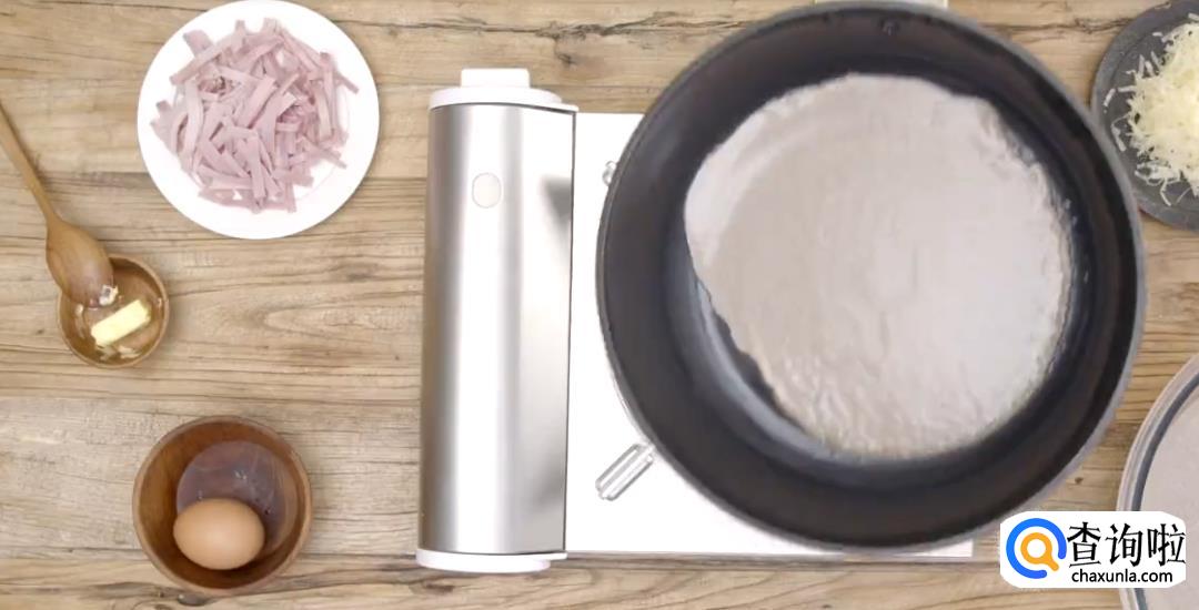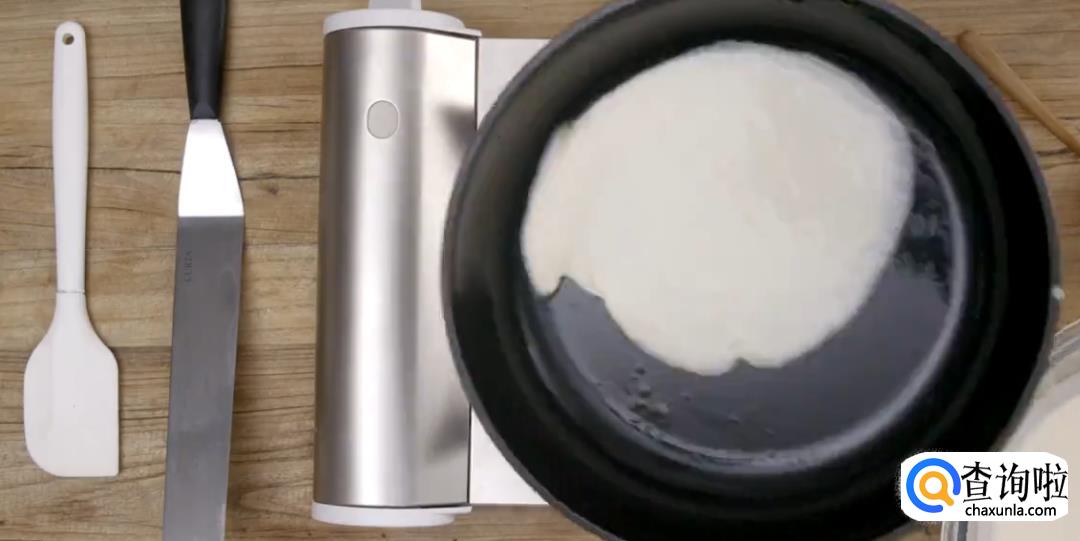 倒入冷藏后的面糊,转动锅子,保持中火。