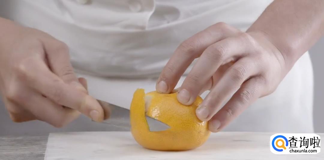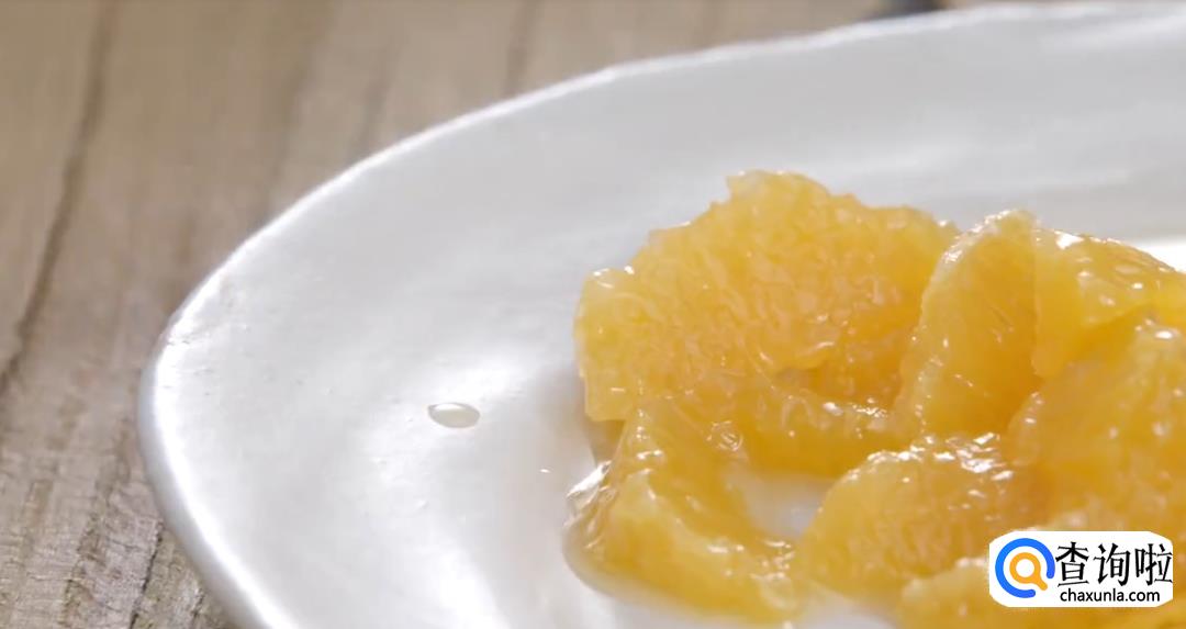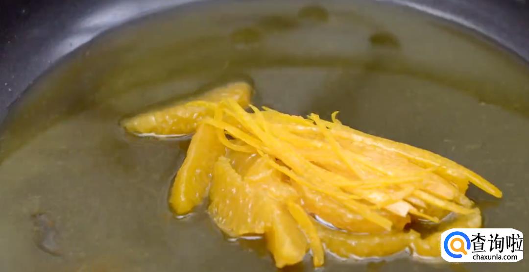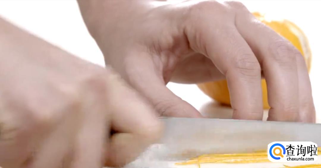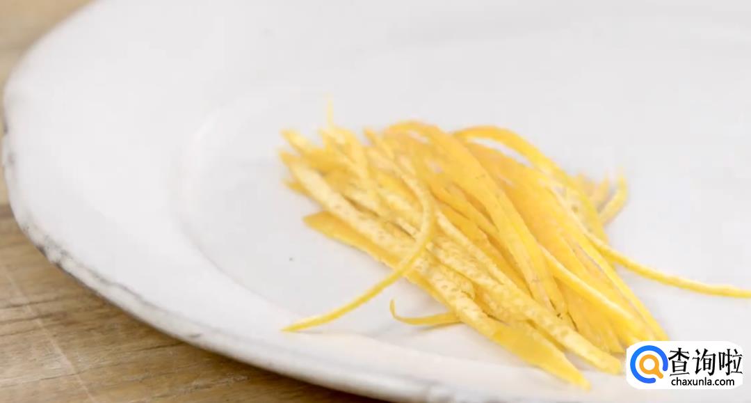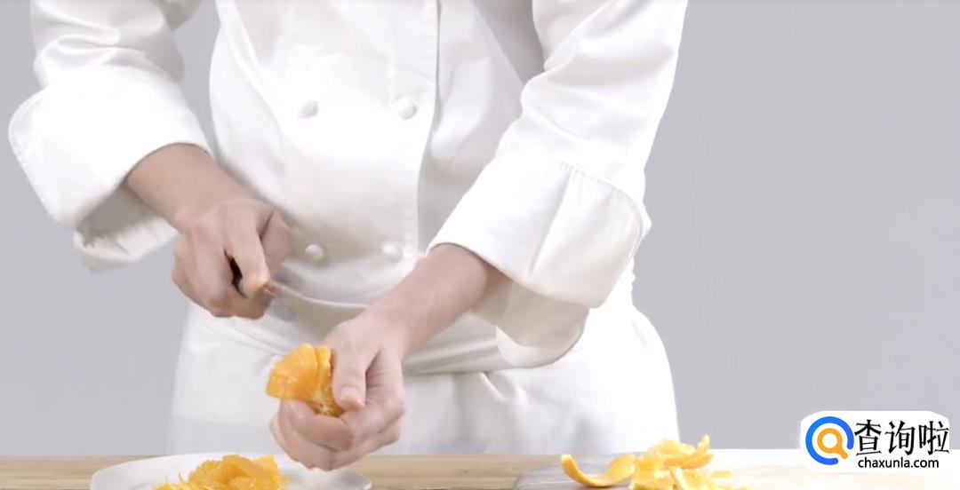 再取一个柑橘,去皮。橘皮切丝,整只果肉切块。