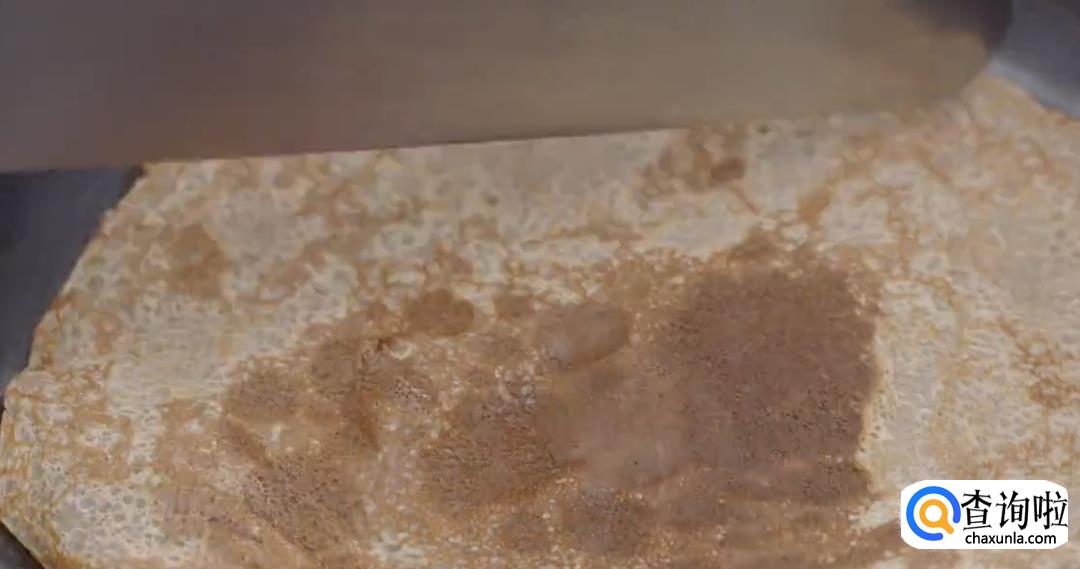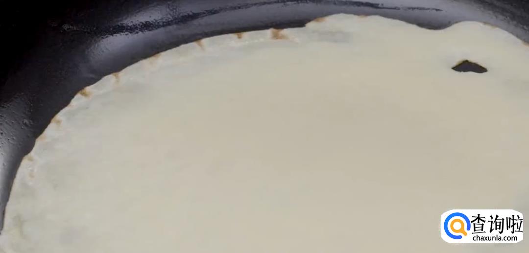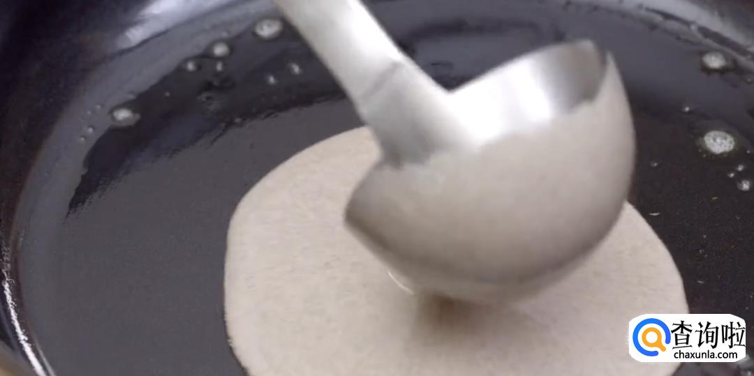 倒入面粉糊,不断转动锅底,形成一张均匀的薄饼。