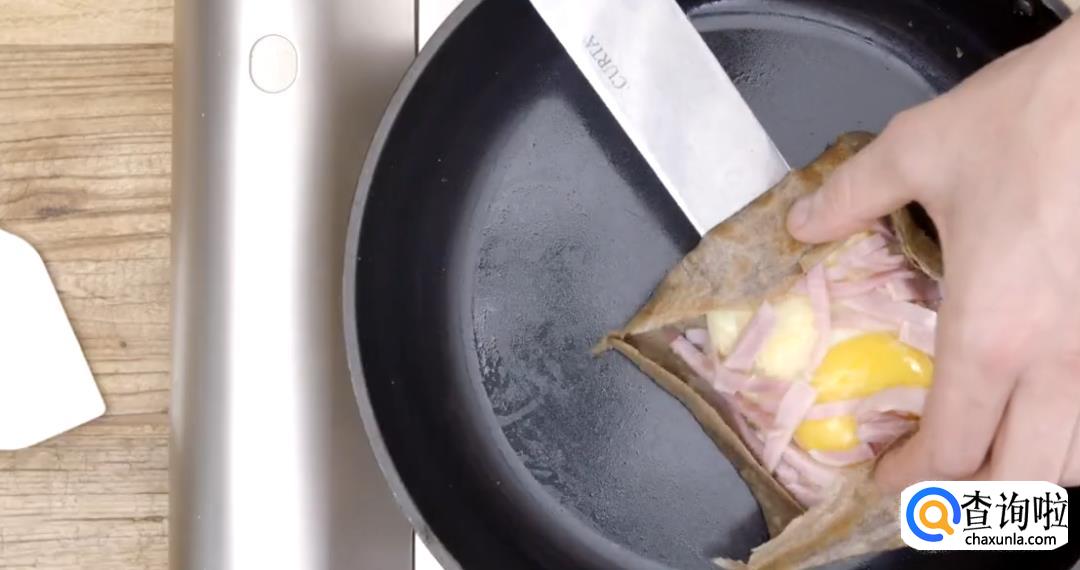 等到边缘变黄之后翻面,加热至饼皮变色。折成三角形就可以盛出了。