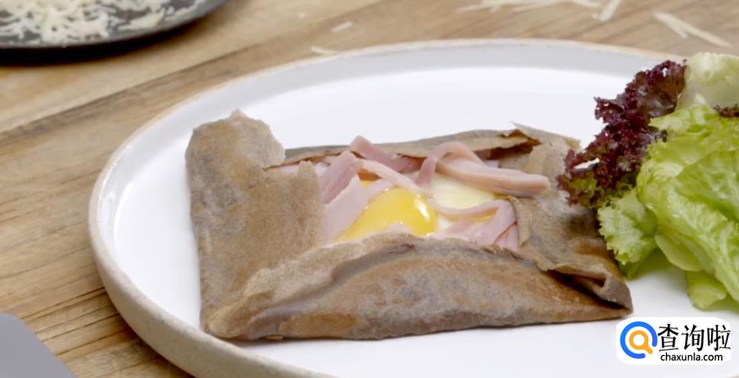等蛋白熟透后,撒上gruyure芝士和法式火腿丝。