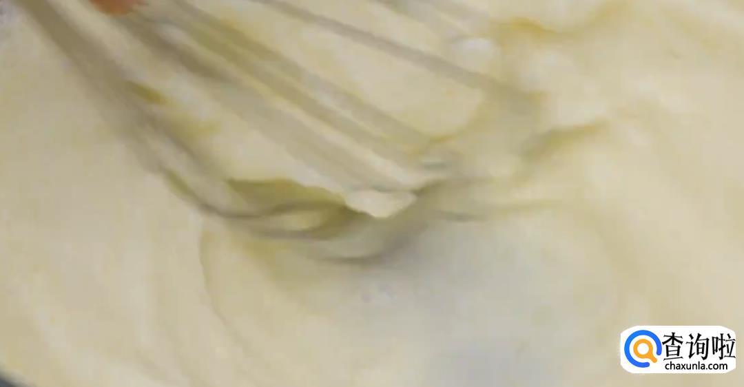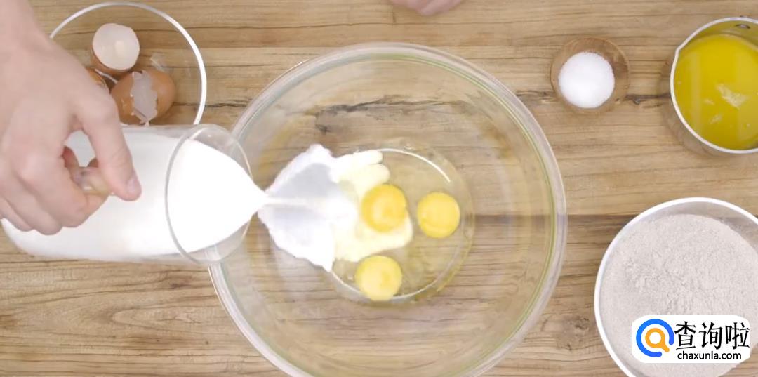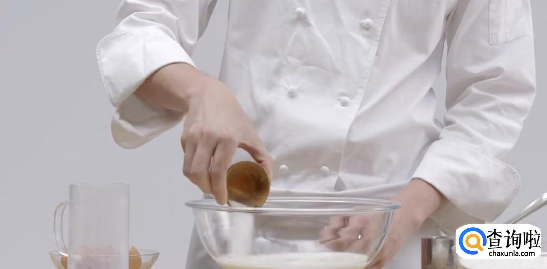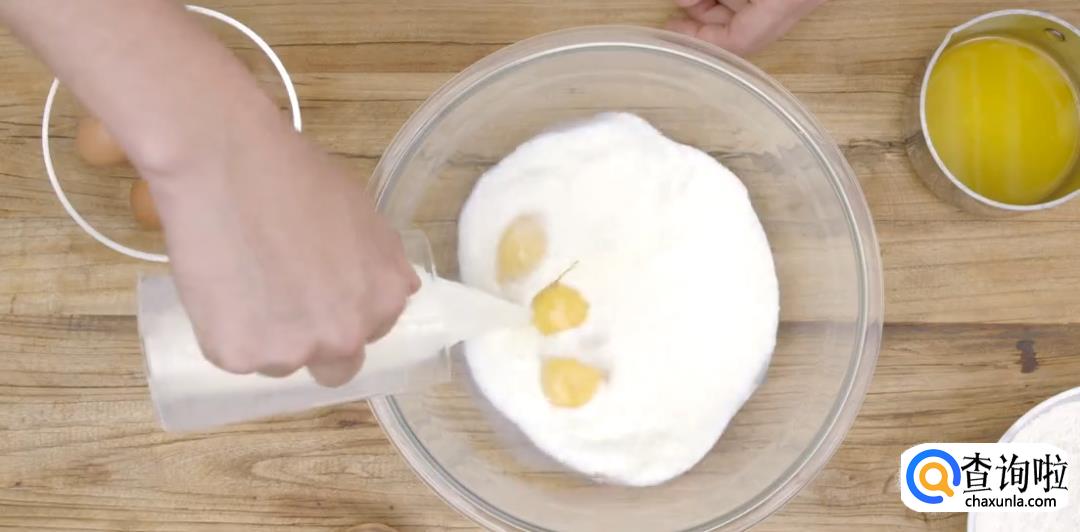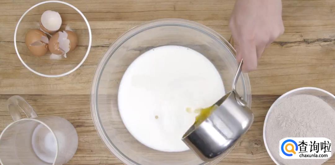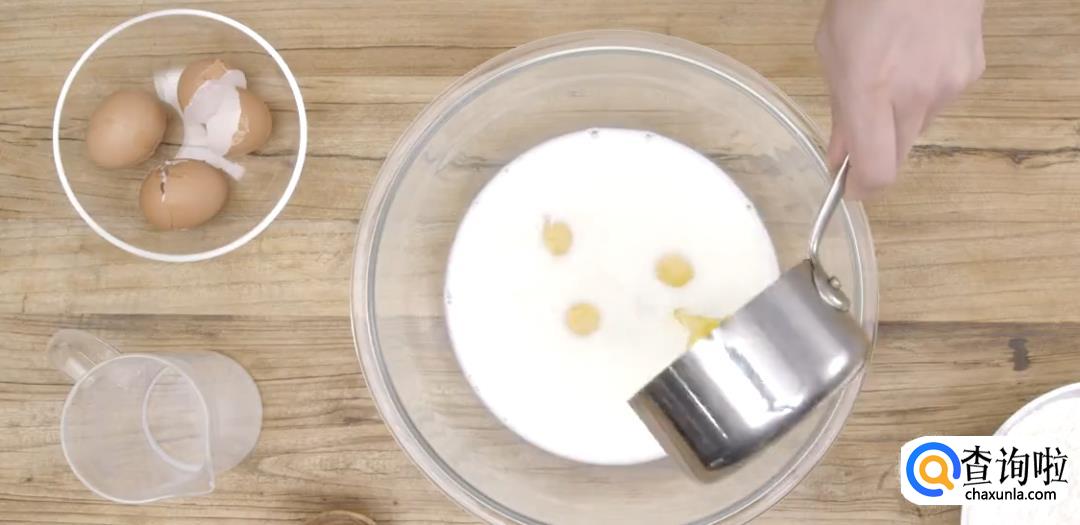 混合鸡蛋,牛奶和白砂糖。加入黄油液体。