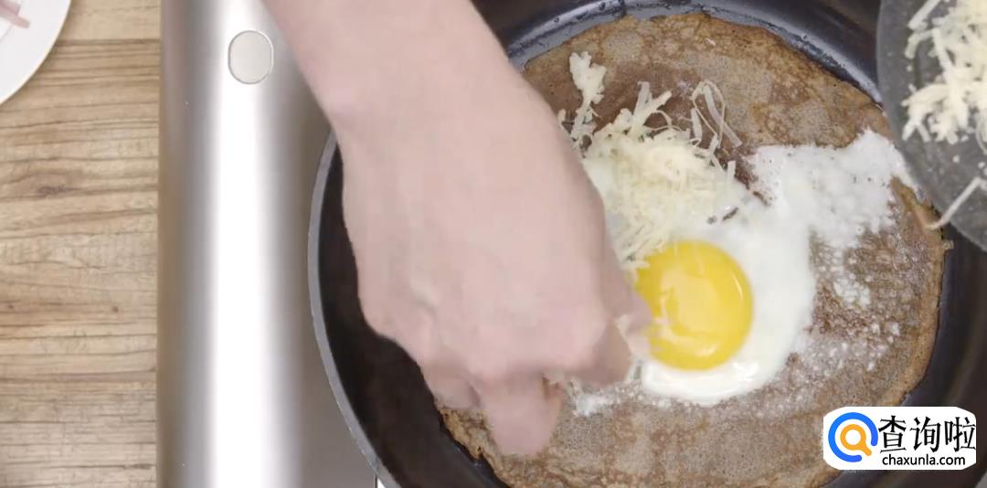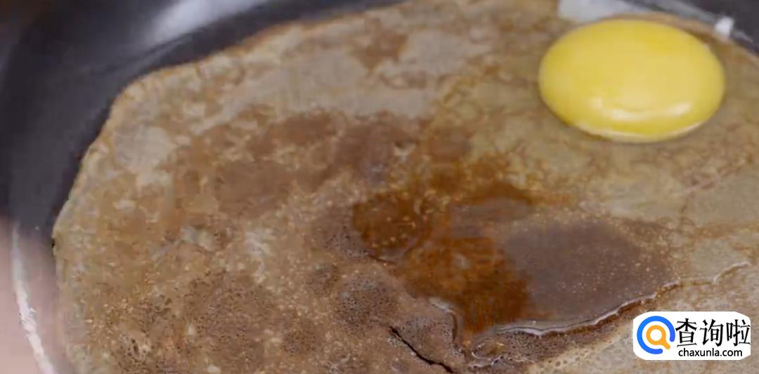 在饼皮正中间打一个鸡蛋,调大火,加热至蛋白稍稍凝结再转小火。