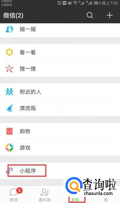 首先,我们打开我们的微信,然后我们点击发现,之后我们点击小程序;