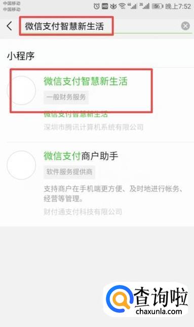 然后我们输入微信支付智慧新生活,之后我们进行搜索,弹出的界面,我们点击微信支付智慧新生活;