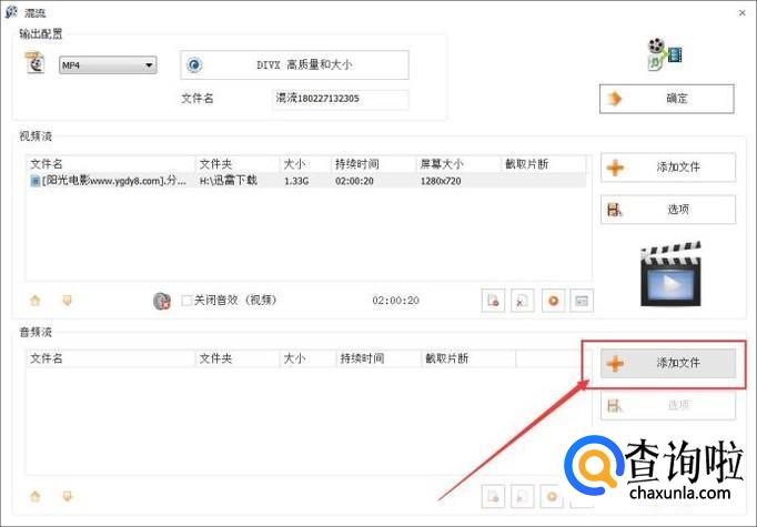 视频文件选择好之后,点击下面的“添加文件”按钮,选择要进行混流的音频文件。