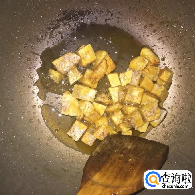 接着把炸好的芋头倒入锅中,搅拌上糖,如下图所示。
