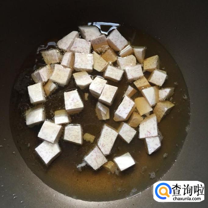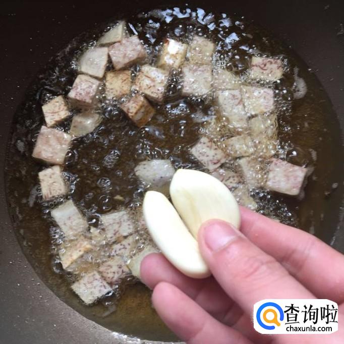 然后往锅中加入适量的食用油,待油冒烟,倒入芋头炸5分钟。