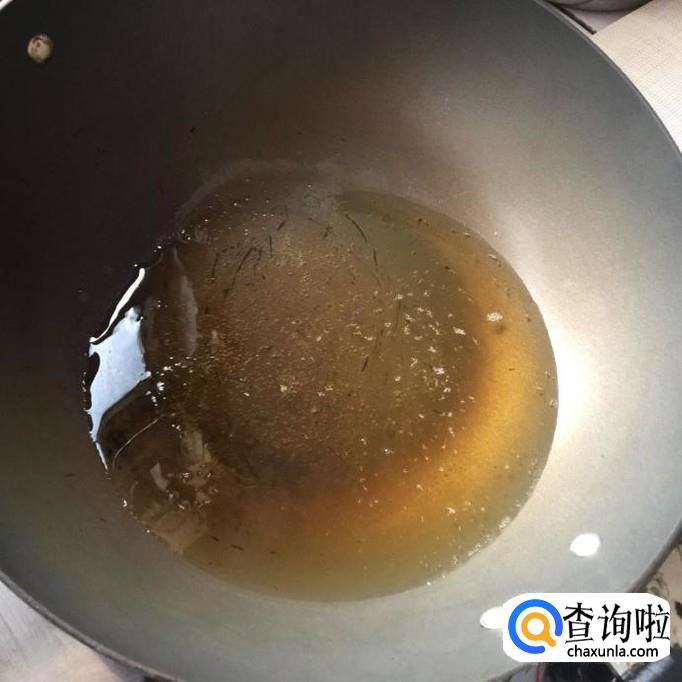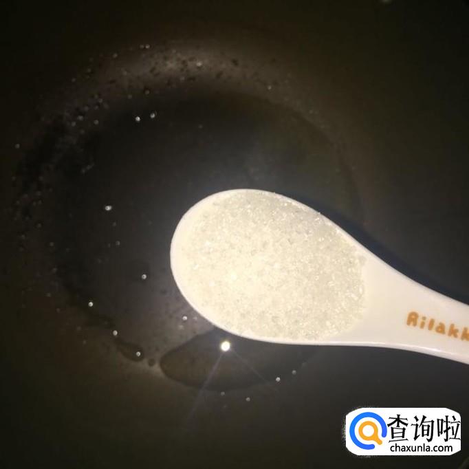 然后往锅中加入适量的食用油,待油冒烟,倒入两勺白砂糖并用锅铲搅拌均匀直至融化。