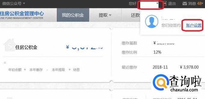 登录后,进入了“我的公积金”页面,如图所示,光标移到个人姓名上,会出现浮动框,我们点击其中的“账户设置”。