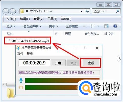 刚才双方通话的内容就被保存在了一个高质量的mp3文件中,可以通过点击软件界面上的“查看”按钮,找到刚才录制下来的文件。我们可以通过使用任意播放器,对该mp3文件进行播放,通常只需要双击,操作系统就会使用默认的播放器对其进行播放,这样,微信语音通话录音的功能就实现了。