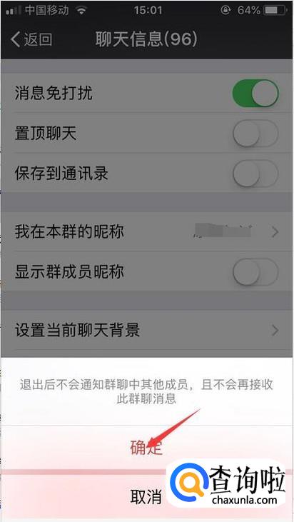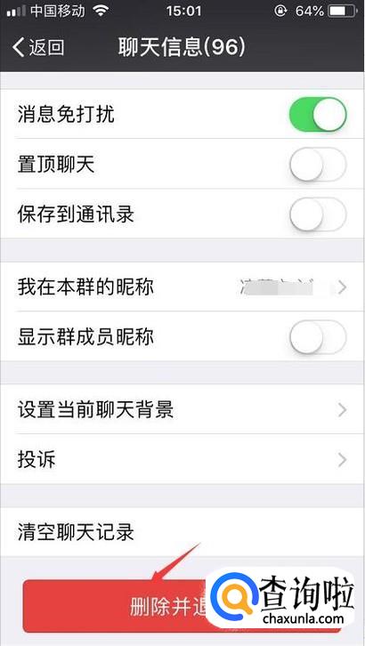 最后我们在聊天信息的页面一直往下拉,就能够看到删除并退出的功能,点击一下。