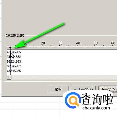 转到第二步的向导面板,如图所示,在字母与数字之间点击一下,生成一个箭头,把单元格数据一分为二。再点击面板右下角的“完成”按钮。
