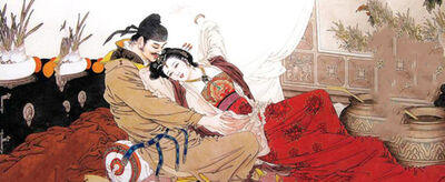“一树梨花压海棠”是民间故事里的一句诗,化用自元稹诗《白衣裳二首》的“一朵梨花压象床”,用来调侃老年丈夫娶年轻妻子。