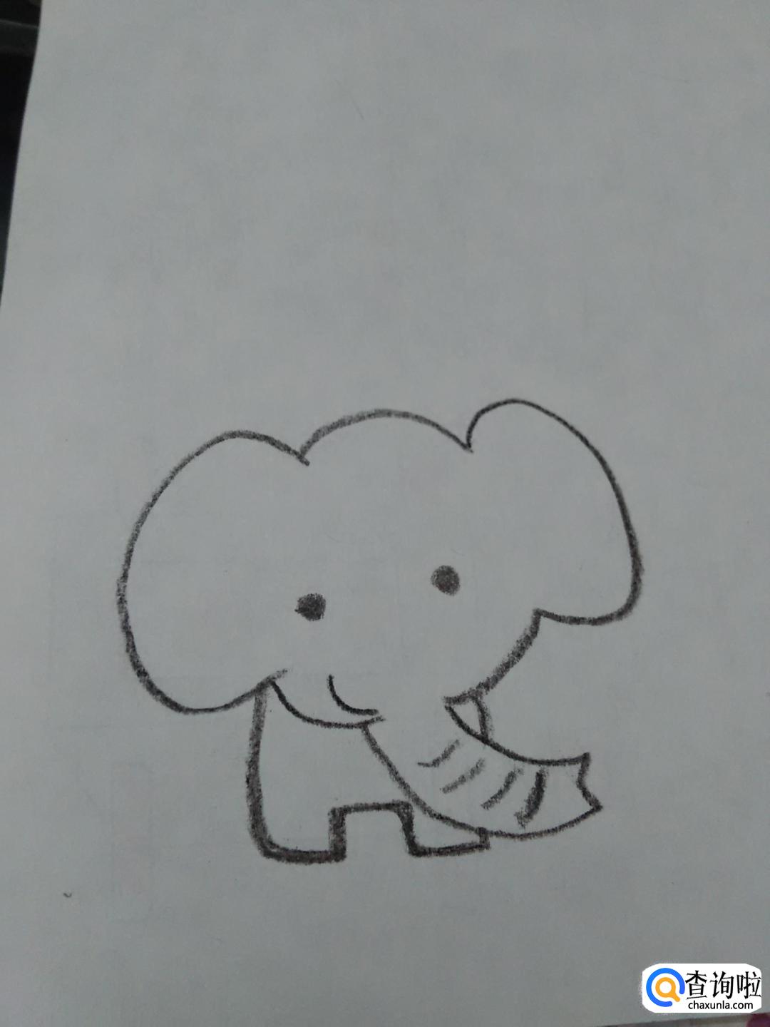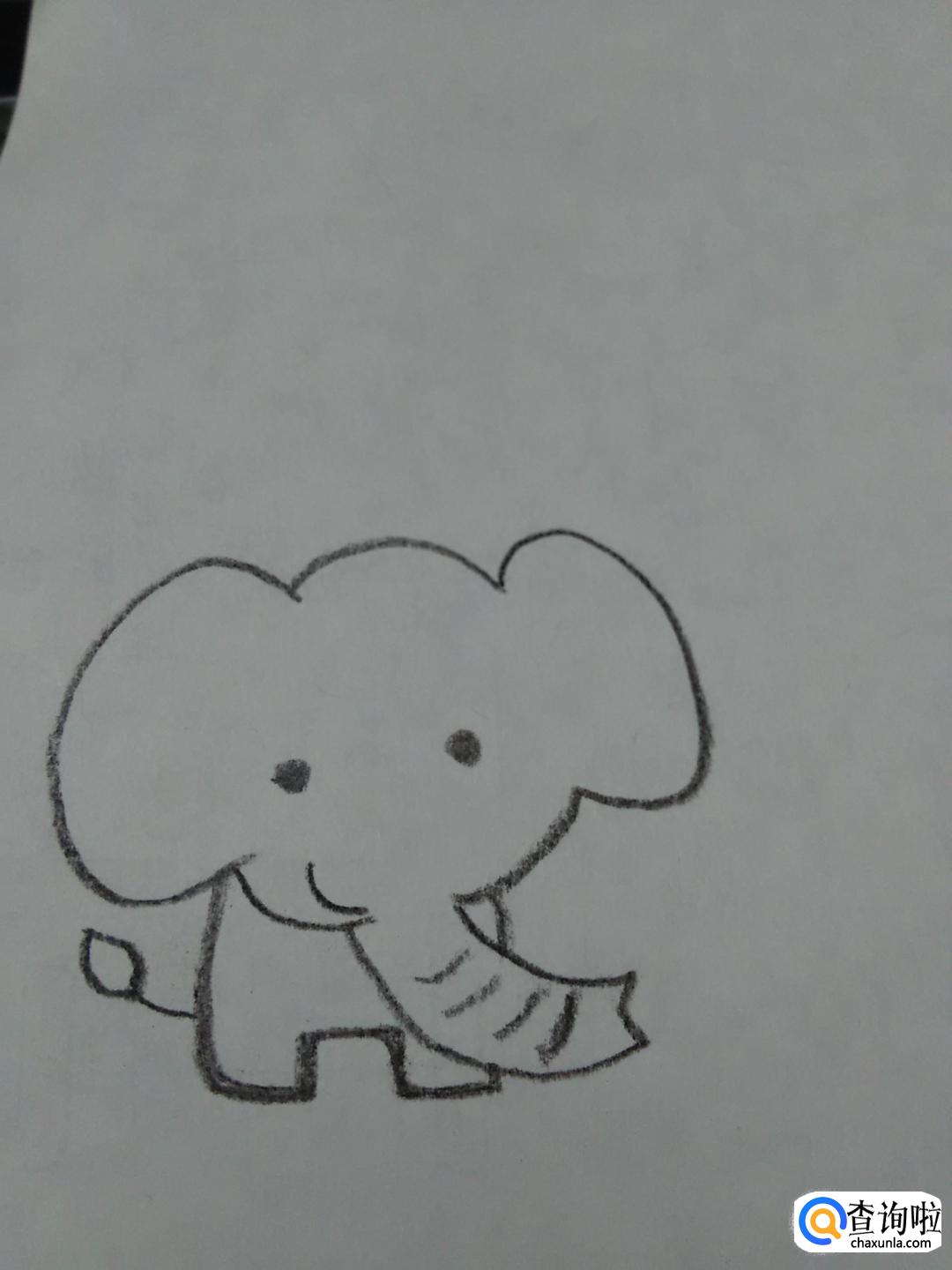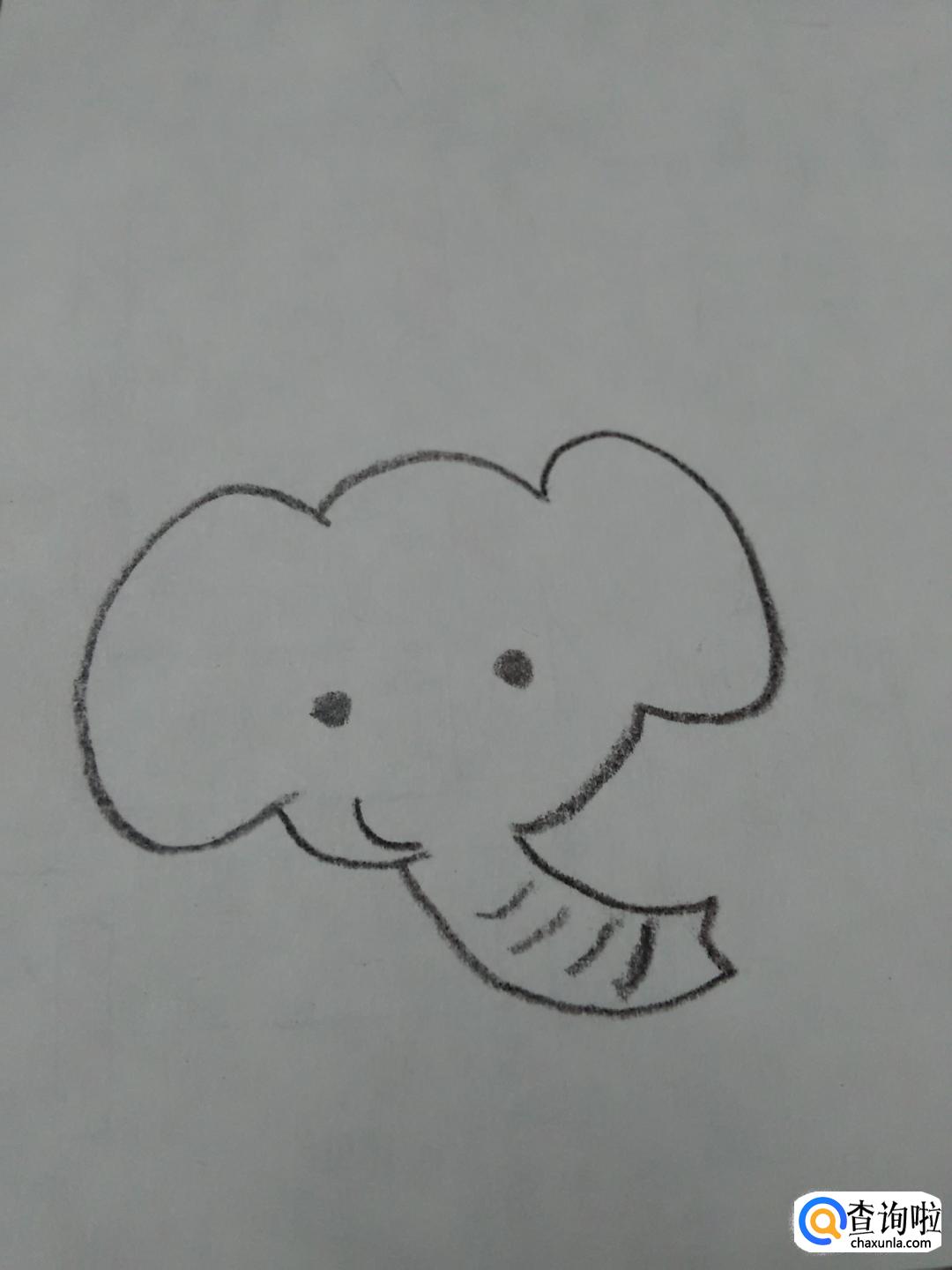 在大象的脸上,画两个黑点和一条弧线,表示大象的眼睛和嘴。