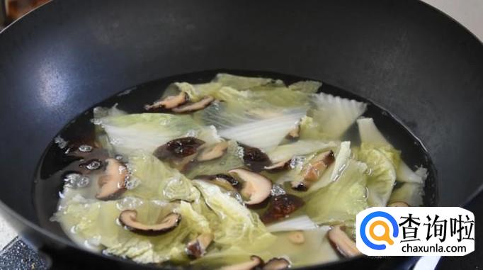 入锅加水,先煮熟香菇后再放入白菜煮