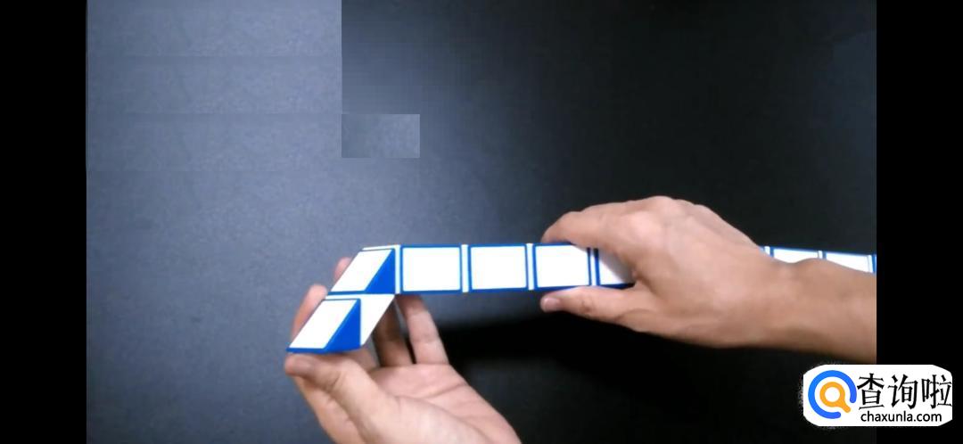 首先,将一长条的魔尺的前两节顺时针旋转,如图所示。