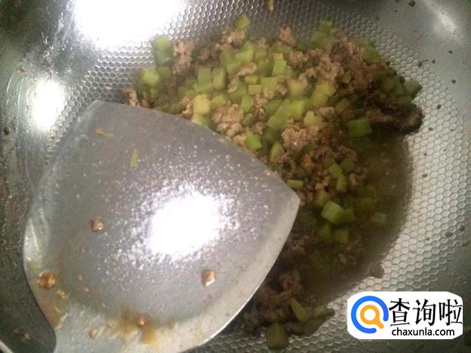 加莴笋丁与肉末一起翻炒。