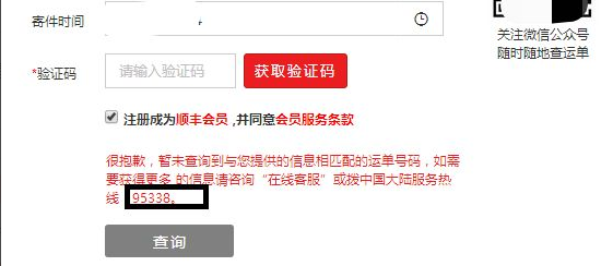 若出现“暂未查询到与您提供的信息相匹配的运单号码”的情况,可以点击我的自助专区,选择自助查件,下单,然后点击在线客服,提供收件人的姓名、地址、电话,他可以帮你查件。或拨中国大陆服务热线:95338。